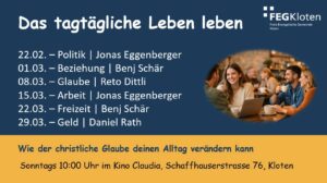 Wir sind eine freie, überkonfessionelle Kirche. Unsere Grundlage ist die Bibel. Wir erleben, dass der Glaube an Gott uns Sinn im Leben gibt, und dass die Bibel praktische Antworten für den Alltag bereit hat. Die FEG Kloten existiert, um Menschen zu helfen Halt bei Jesus zu finden und zu reifen Persönlichkeiten zu werden.